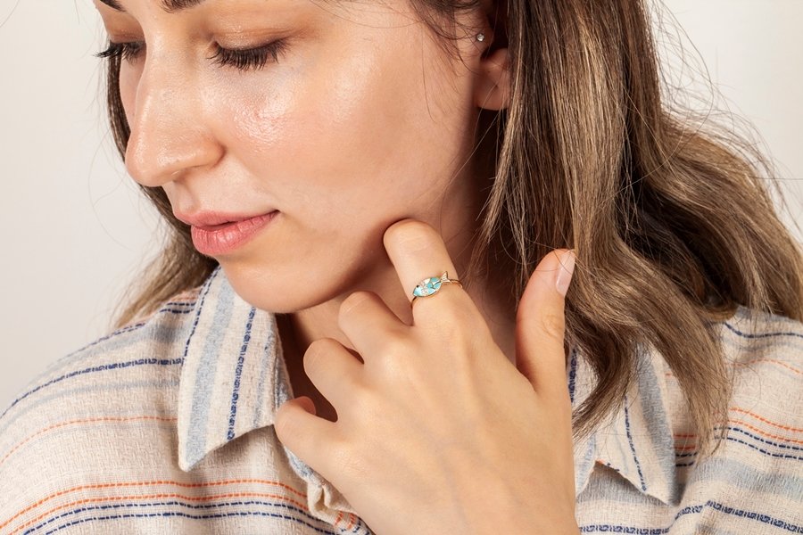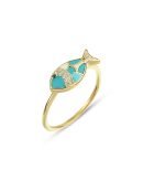 | Maden: Altın Renk: Sarı Ağırlık: 1.65 gr Ayar: 14K | Fiuze renk mine ile desenlendirilmiş zarif balık yüzük. |