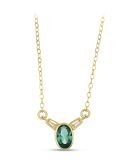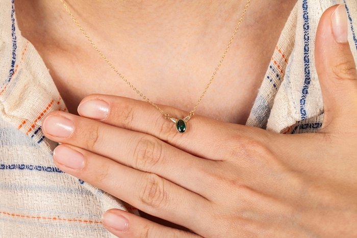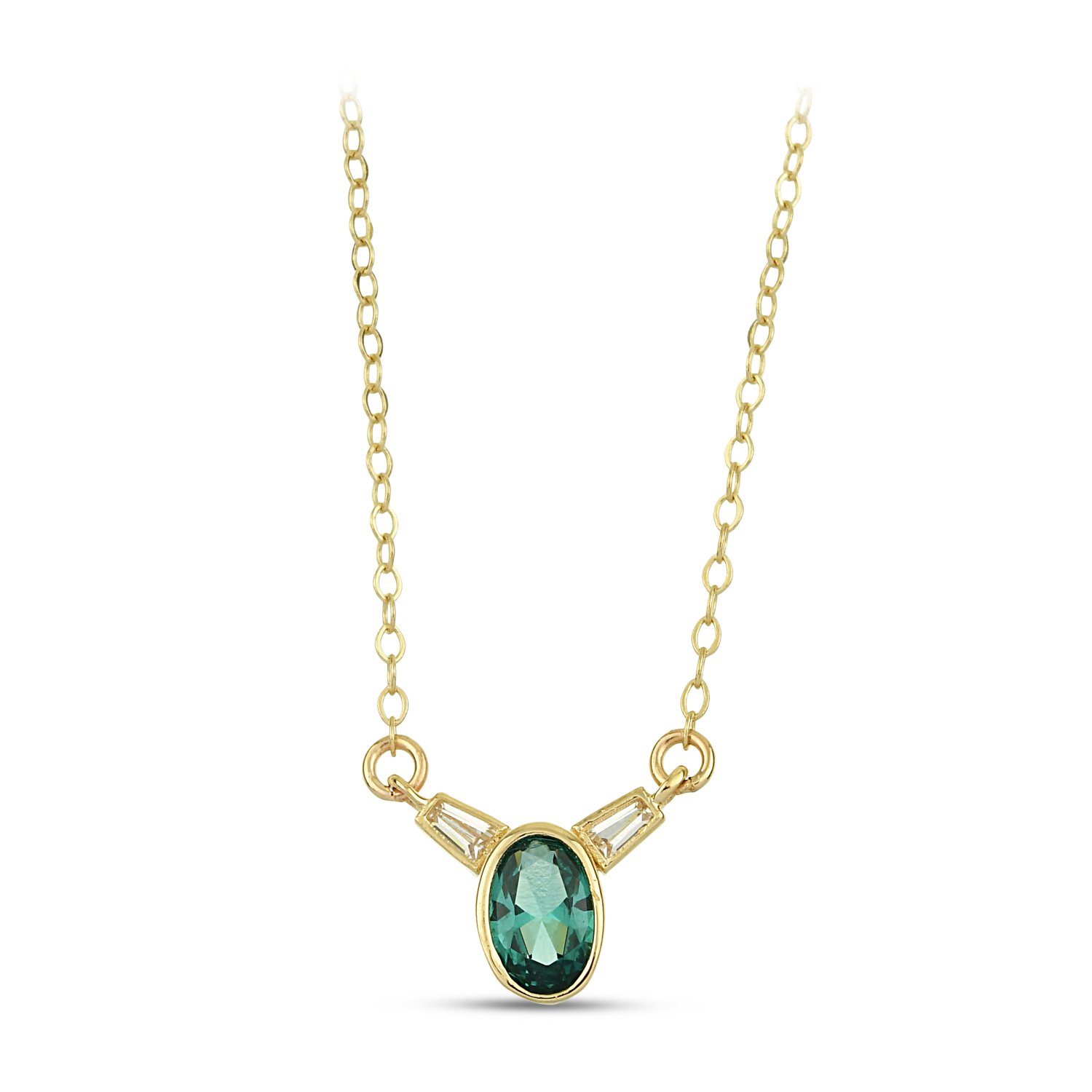 | Maden: Altın Renk: Sarı Ağırlık: 1.78 gr Ayar: 14K | Damla formunda kasa içinde Zümrüt yeşili taş ile şık. Kenarlarında bulunan minimal iki baget taşıyla zarif kolye. |