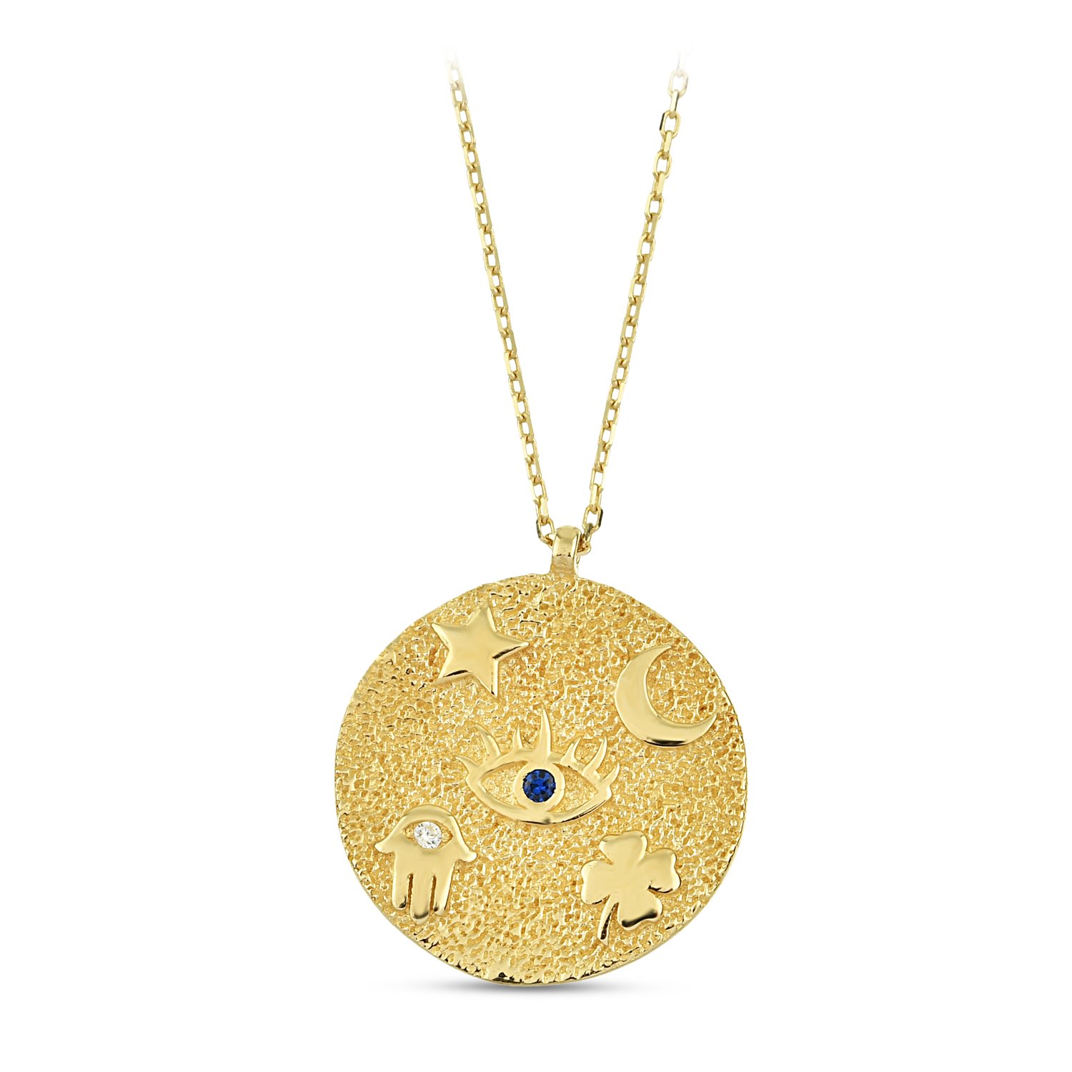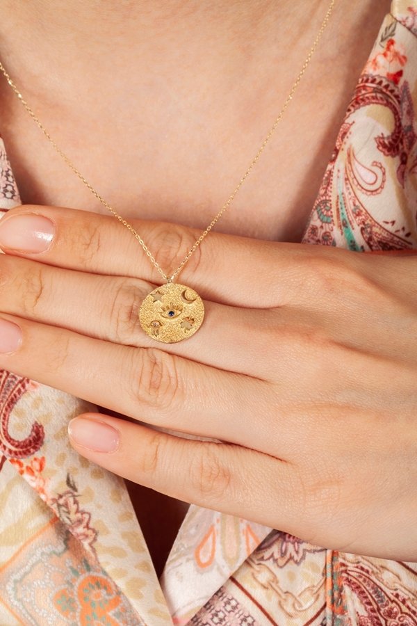 | Maden: Altın Renk: Sarı Ağırlık: 3.20 gr Ayar: 14K | Semai din sembollerinden olan kutsal hilal yıldız Fatma Ana eli, Göz ve Yonca sembolü işlenmiş tasarım. |