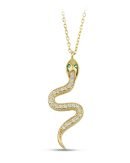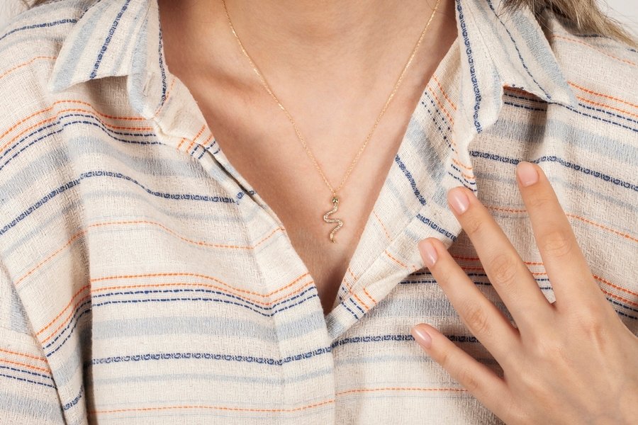 | Maden: Altın Renk: Sarı Ağırlık: 1.89 gr Ayar: 14K | Göz kısmı yeşil czt zümrüt üst kısmı zirkon taşlarla süslü Yılan kolye. Yılan sembolü Anadolunun Şahmeran hikayesinde bolluk ve bereket ile anılmaktadır. |